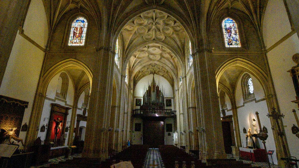La planta es de cruz latina y presenta tres naves con una gran capilla mayor flanqueada por otras dos que abren al transepto. Los pilares son fasciculados con capitel de cardina, entre los que danzan arcos apuntados. Para las monumentales cubiertas se usaron bóvedas estrelladas sobre las naves y de terceletes en el crucero.