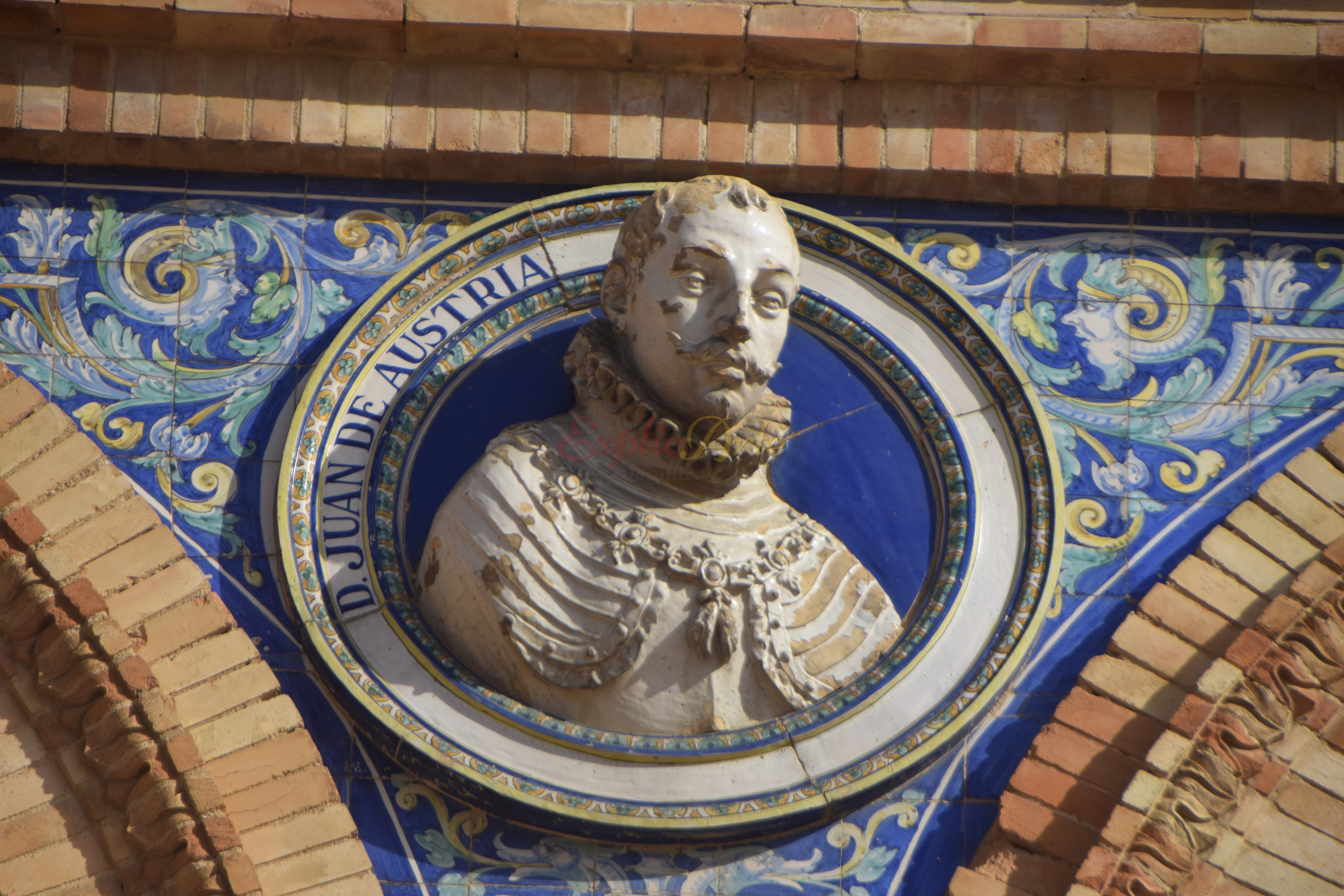 Si quieres, por Amor al Arte, déjame ExplicArte Sevilla, déjame ExplicArte el busto de Don Juan de Austria, en la enjuta, entre los arcos de las provincias de Lérida, y de Logroño (La Rioja) de la Plaza de España, de Sevilla. Sólo tienes que contactar con nosotros en Contacto, y a disfrutar de la ciudad.